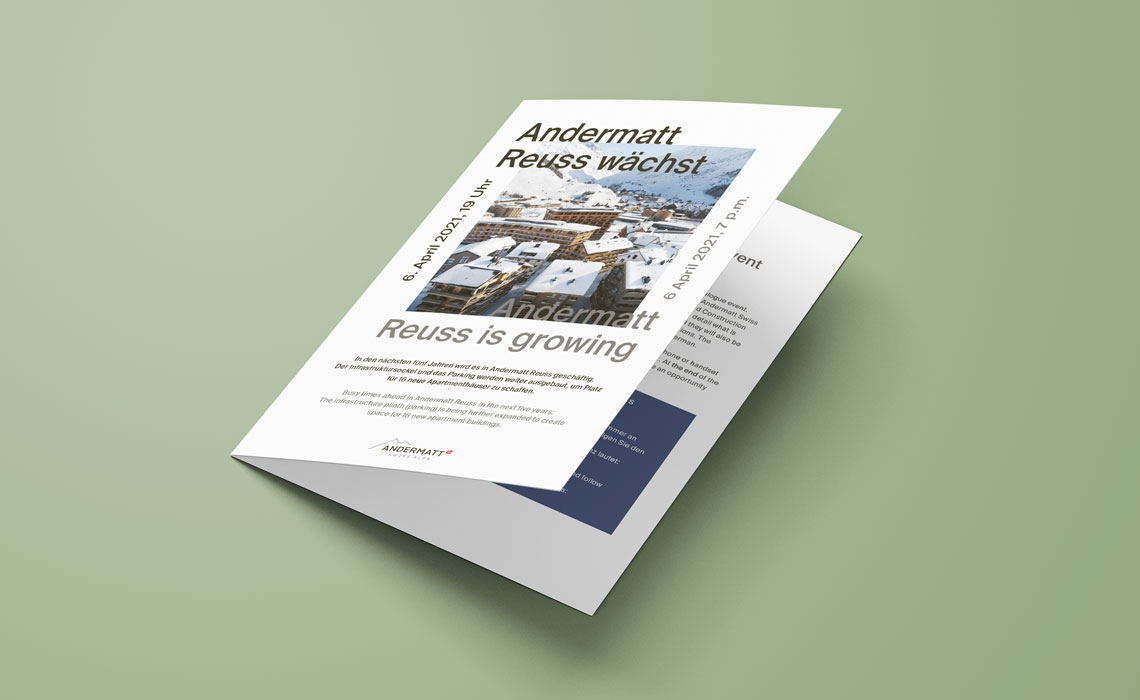 Von allem Anfang an durften wir die Entwicklung der Destination Andermatt mit markanten Kommunikationsprodukten unterstützen. Zu den aktuellsten Aufträgen von Andermatt Swiss Alps gehörten verschiedene Flyers, Baustelleninformationen und -pläne, Eventbroschüren und Illustrationen für interne Magazine. Selbstverständlich sind wir auch selber immer wieder gern im Urserntal unterwegs!