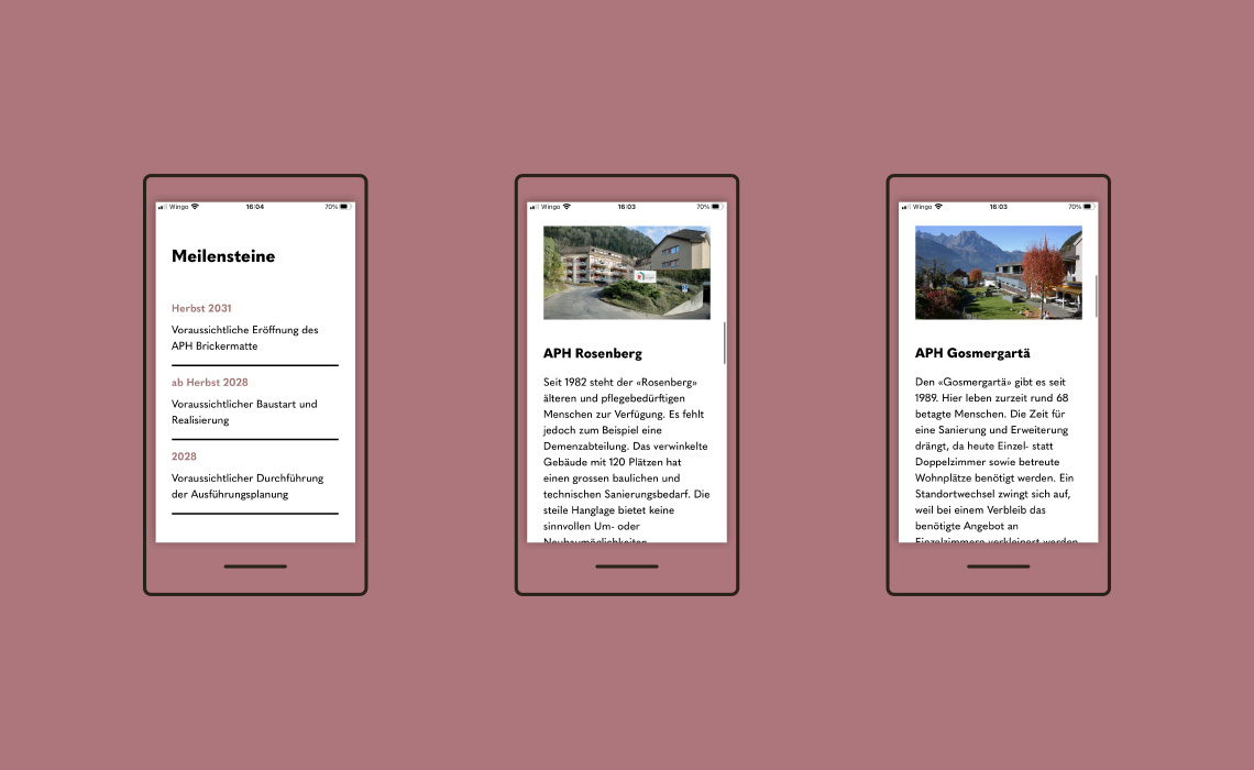 Auch in Uri gibt es künftig mehr betagte und pflegebedürftige Menschen. Ihnen soll ein gutes stationäres, intermediäres und ambulantes Angebot zur Verfügung stehen. Auf der Brickermatte ist dazu ein neues Alterszentrum für Altdorf, Bürglen sowie die Region Schächental geplant. Brickermatte 2030+ ist ein anspruchsvolles Generationenprojekt. Wir unterstützen es in der situativen Kommunikation. Die Website zeigt einen kompakten Einblick in das Vorhaben.