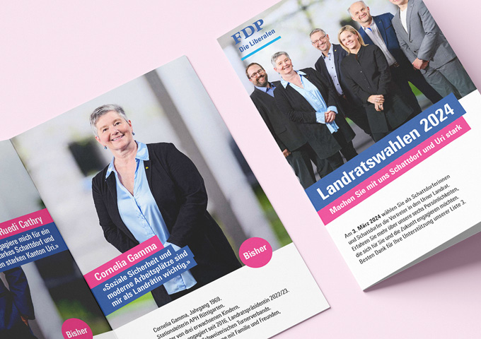 2024 wurde mit dem Landrat die 64 Mitglieder der Urner Legislative gewählt. Für die FDP.Die Liberalen Uri setzte das tinto-Team die komplette politische Kampagne um. Dazu gehörte eine umfassende professionelle Beratung, die Organisation des Fotoshootings der Kandidierenden ebenso wie die Gestaltung der Wahlunterlagen. Die Ideen der Kantonal- und einigen Ortsparteien wussten auf den von uns realisierten Kommunikationsmitteln (Plakate, Broschüren, Flyer, Inserate, Blachen, Kleber) in Print und digital zu überzeugen. Die Anliegen von einzelnen Kandidatinnen und Kandidaten in Botschaften zu packen, die bei den Urnerinnen und Urner ankamen, rundeten unser Engagement zu den Wahlen ab.